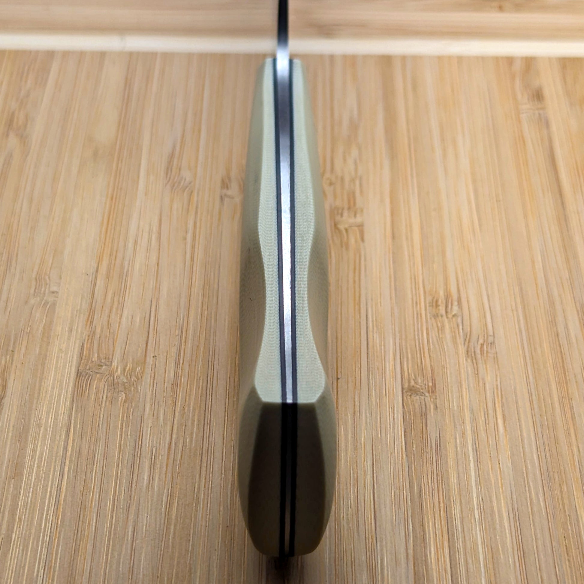 This slender 8" Chef's knife is light and sharp. The Damascus is 110+ layers of 1084 & 15N20 with a Santoku style profile. The handle is Ivory G10 and should fit most hands as it's not too thin and not too thick.