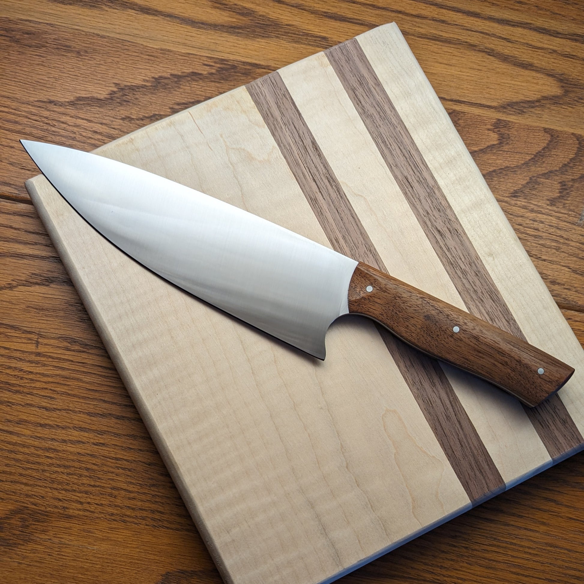 Here is my first non-Damascus Chef's knife. It has an 8" blade with a stabilized walnut handle. This is an extremely sharp knife that will hold an edge, and it is an excellent choice if you are looking for a high quality blade that is not pattern welded steel.