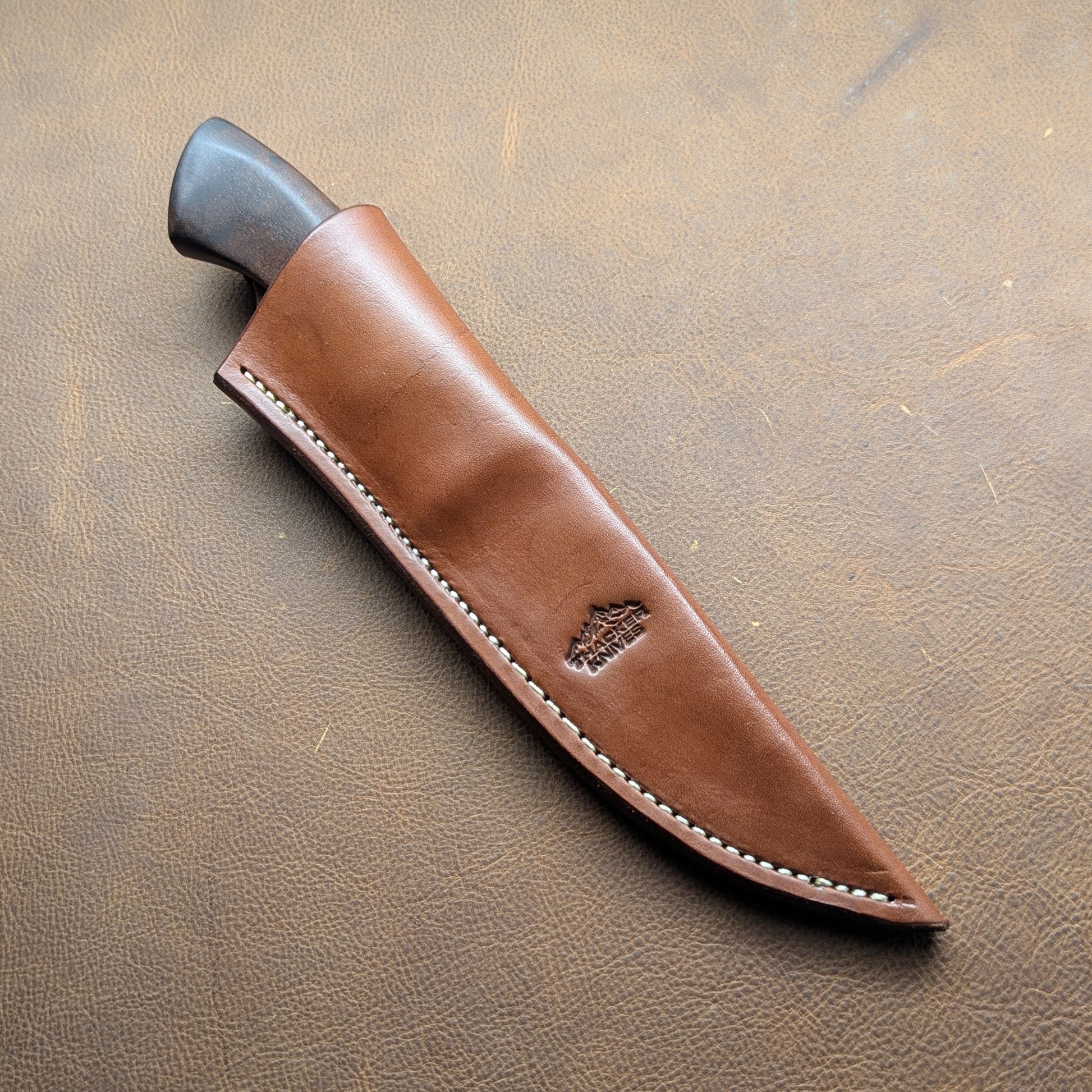 This hand forged hunting knife is made from 1084 steel with a nickel silver plate guard. The handle is stabilized toasted curly maple with an excellent feel. This knife includes the handmade, custom fit sheath.
