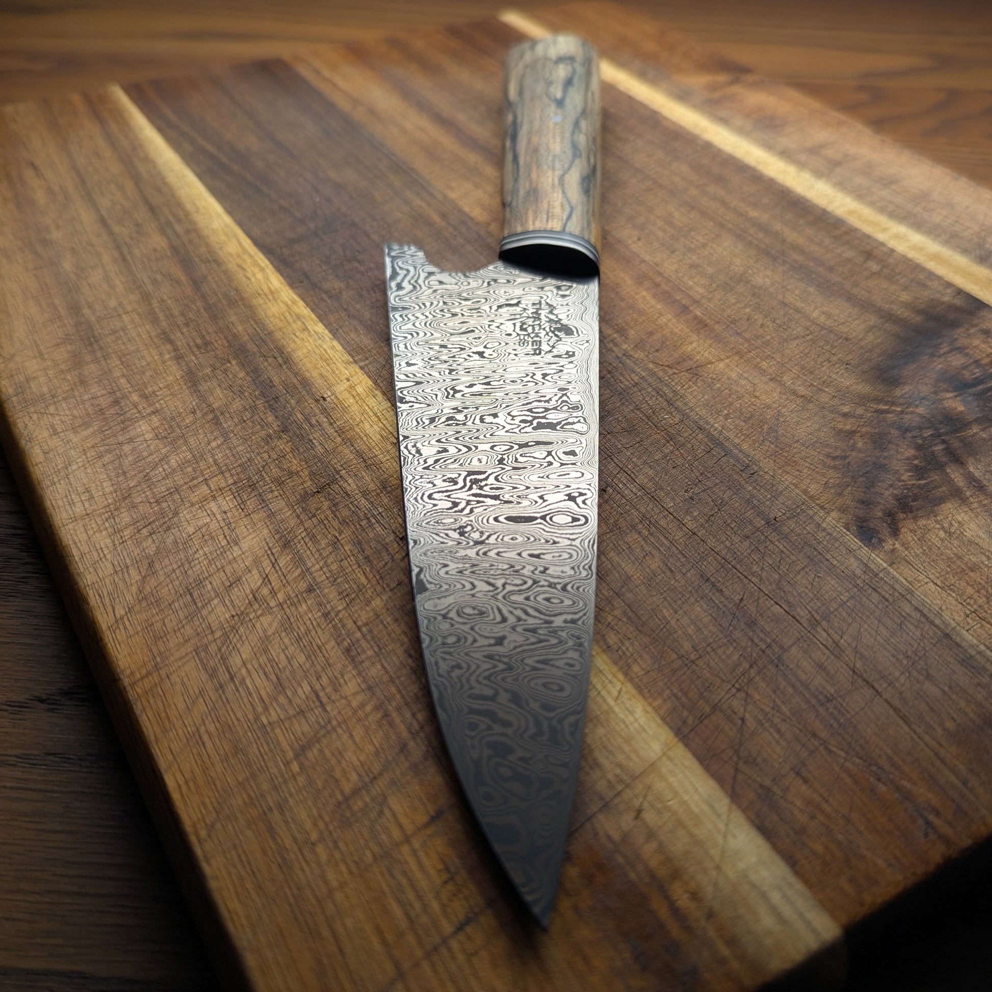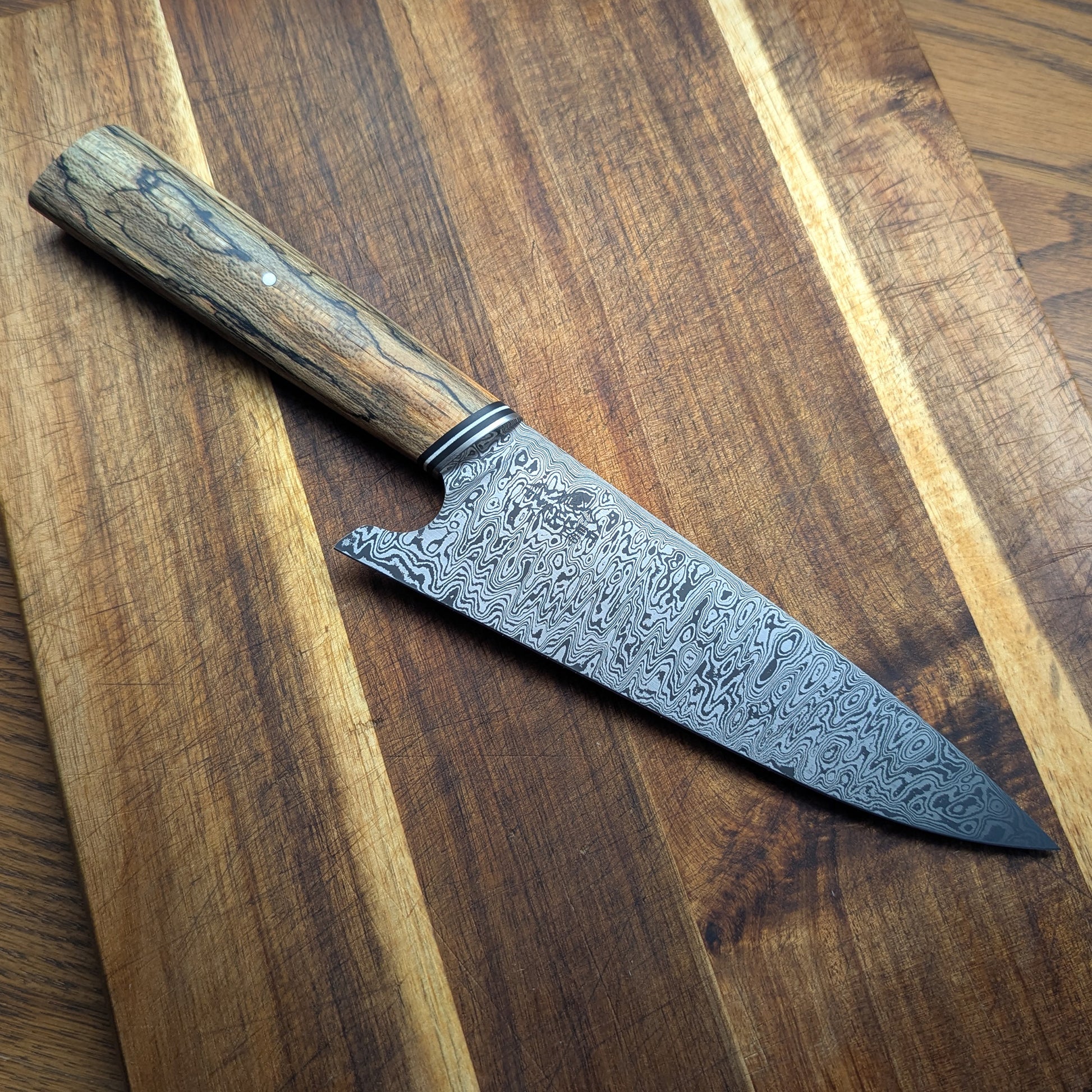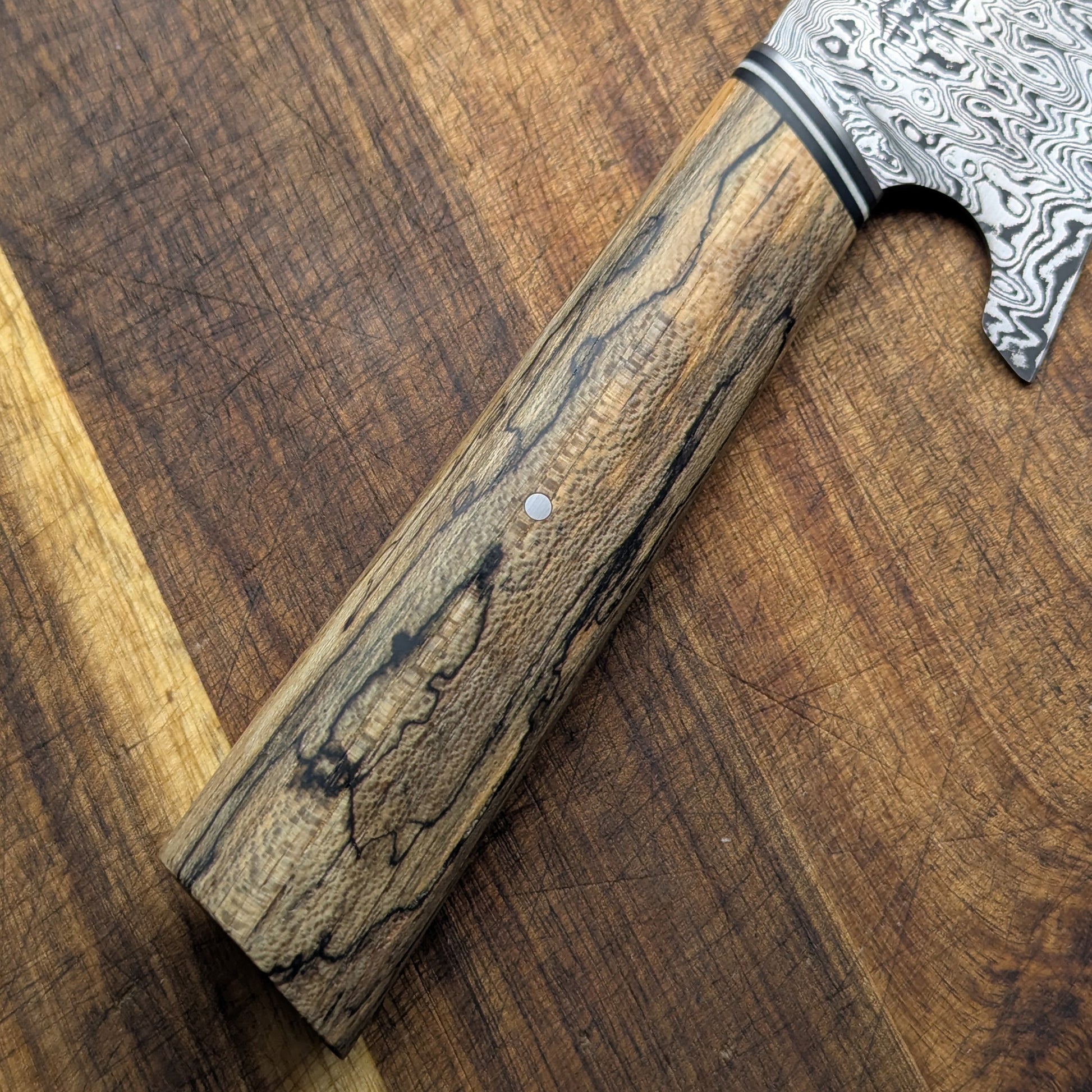 I wanted to experiment with this Damascus Chef's knife giving it a more "custom" profile. The hidden tang really reduces the weight of this 7.25" blade with an overall length of 11.75". The handle is stabilized spalted hickory with black/white/black G10 spacers and a stainless steel bolster. The blade is an interesting random raindrop pattern making for an attractive piece.