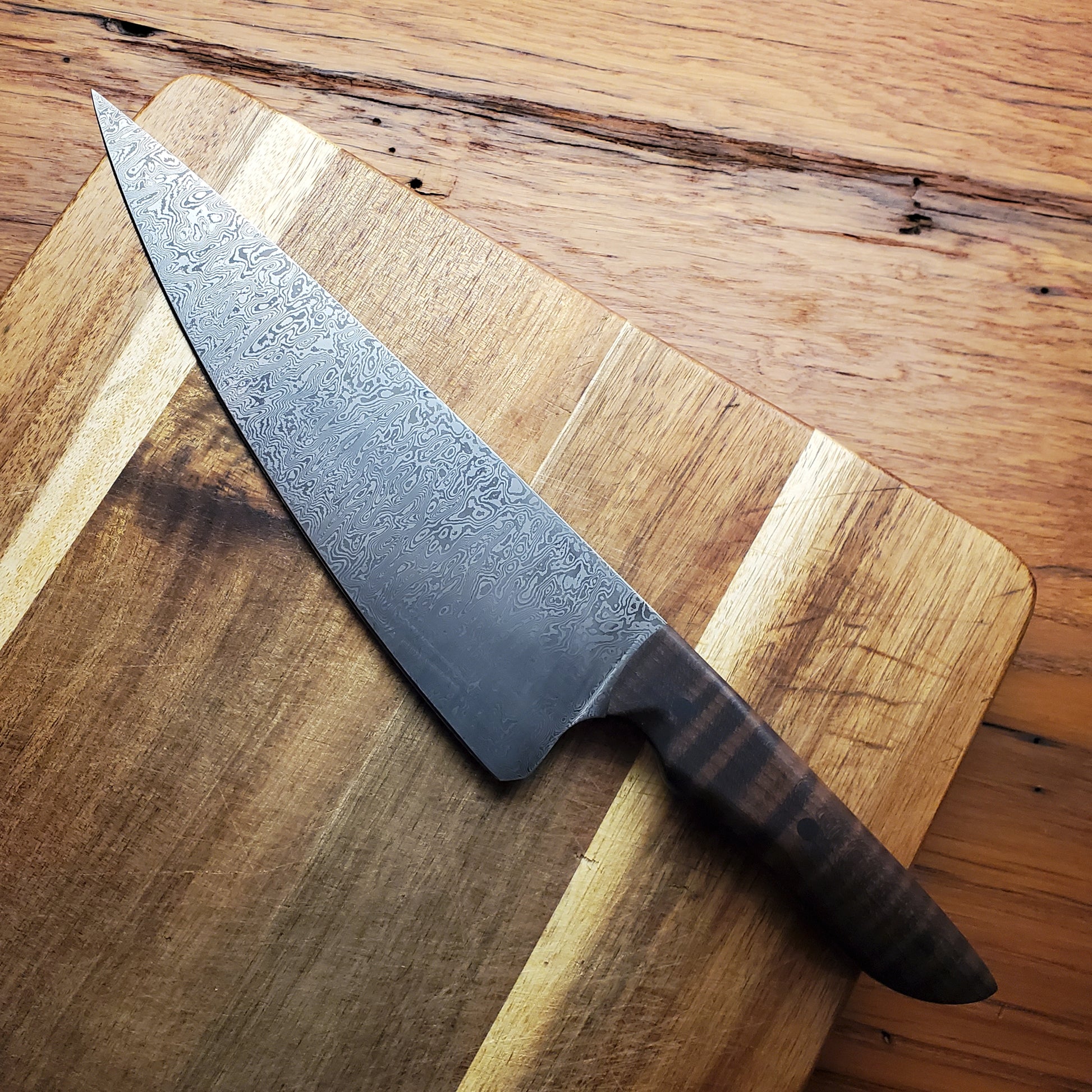 This is a more traditional chef's knife. 110+ layers create a random pattern Damascus with stabilized "toasted" curly maple scales for the handle.