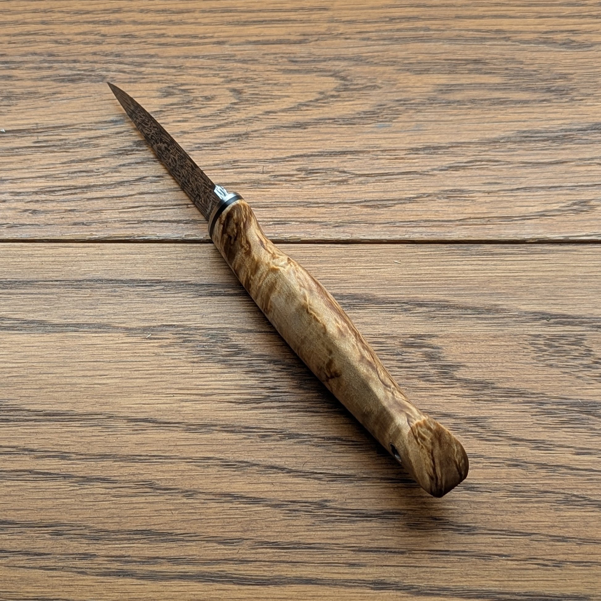 This is a forged Damasteel version of the Bruk Puukko EDC made from a forged endcut of Fafnir pattern Damasteel. With some super grade stabilized curly birch, stainless bolster, pins and lanyard tube, this stainless beauty will make a great companion.