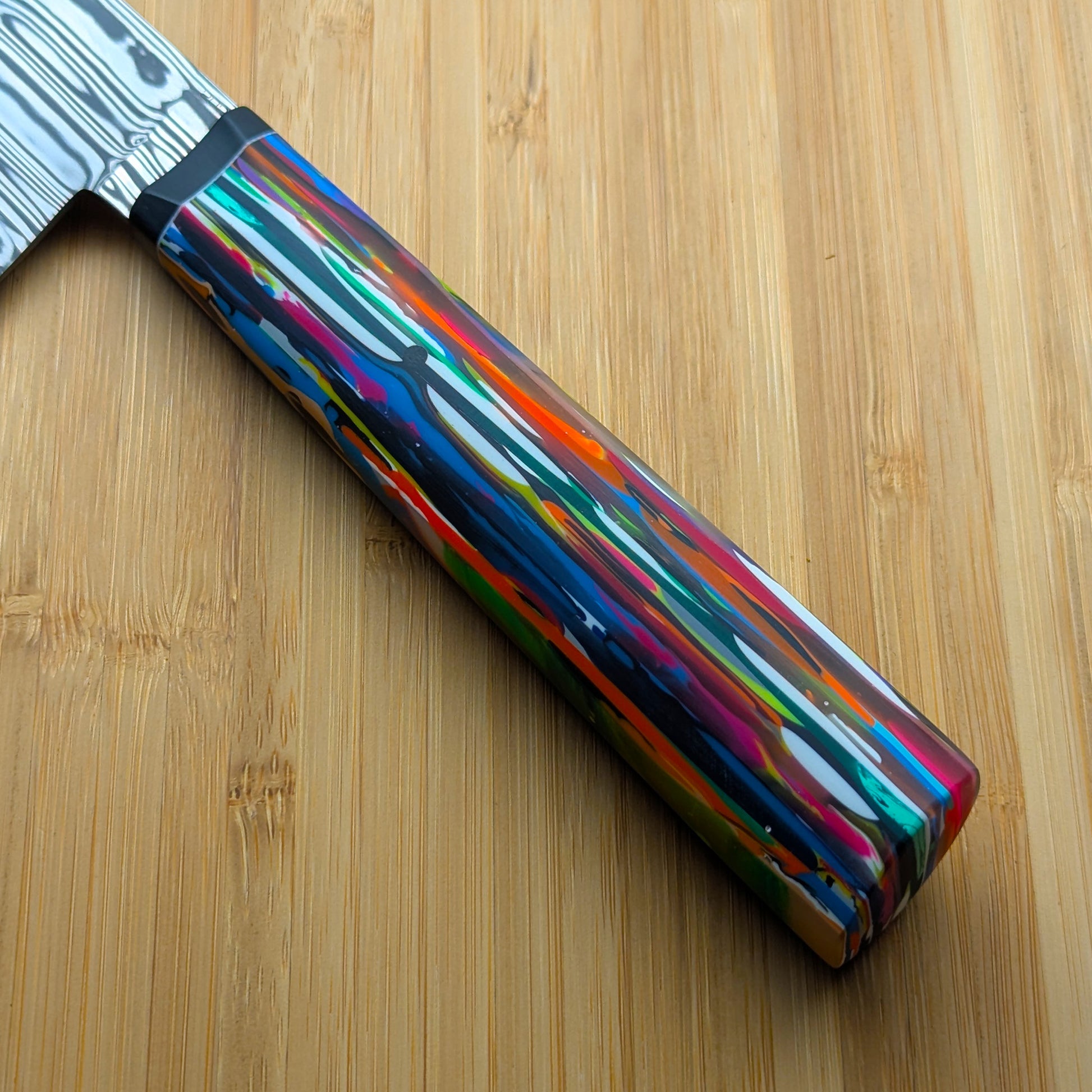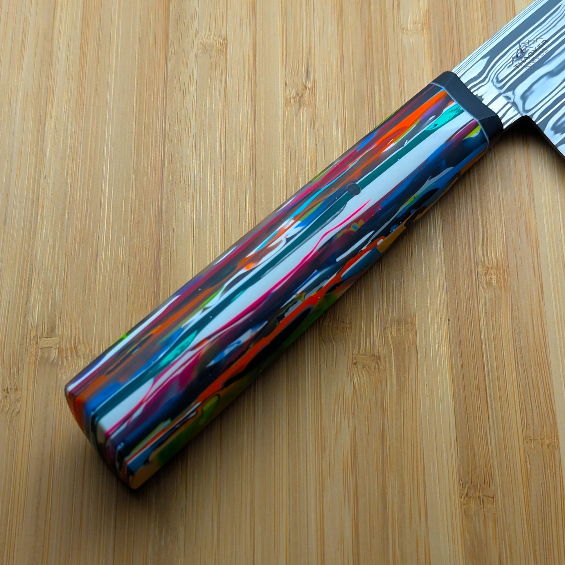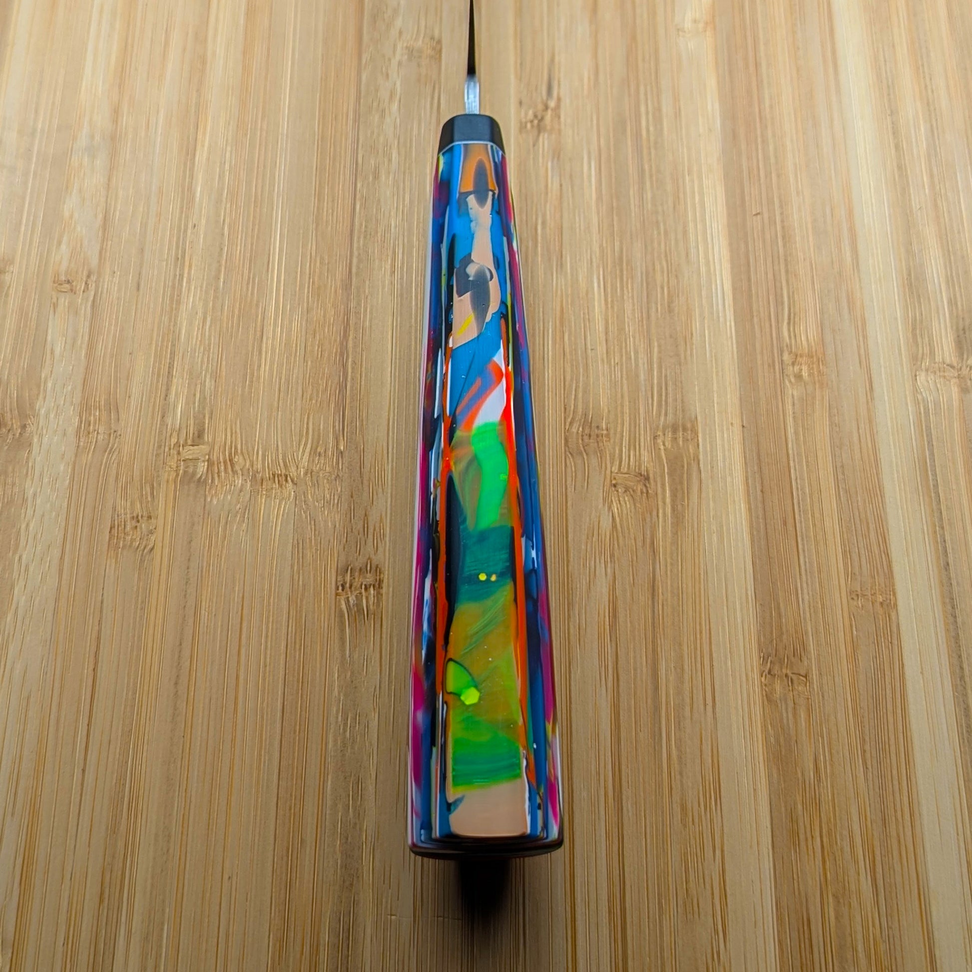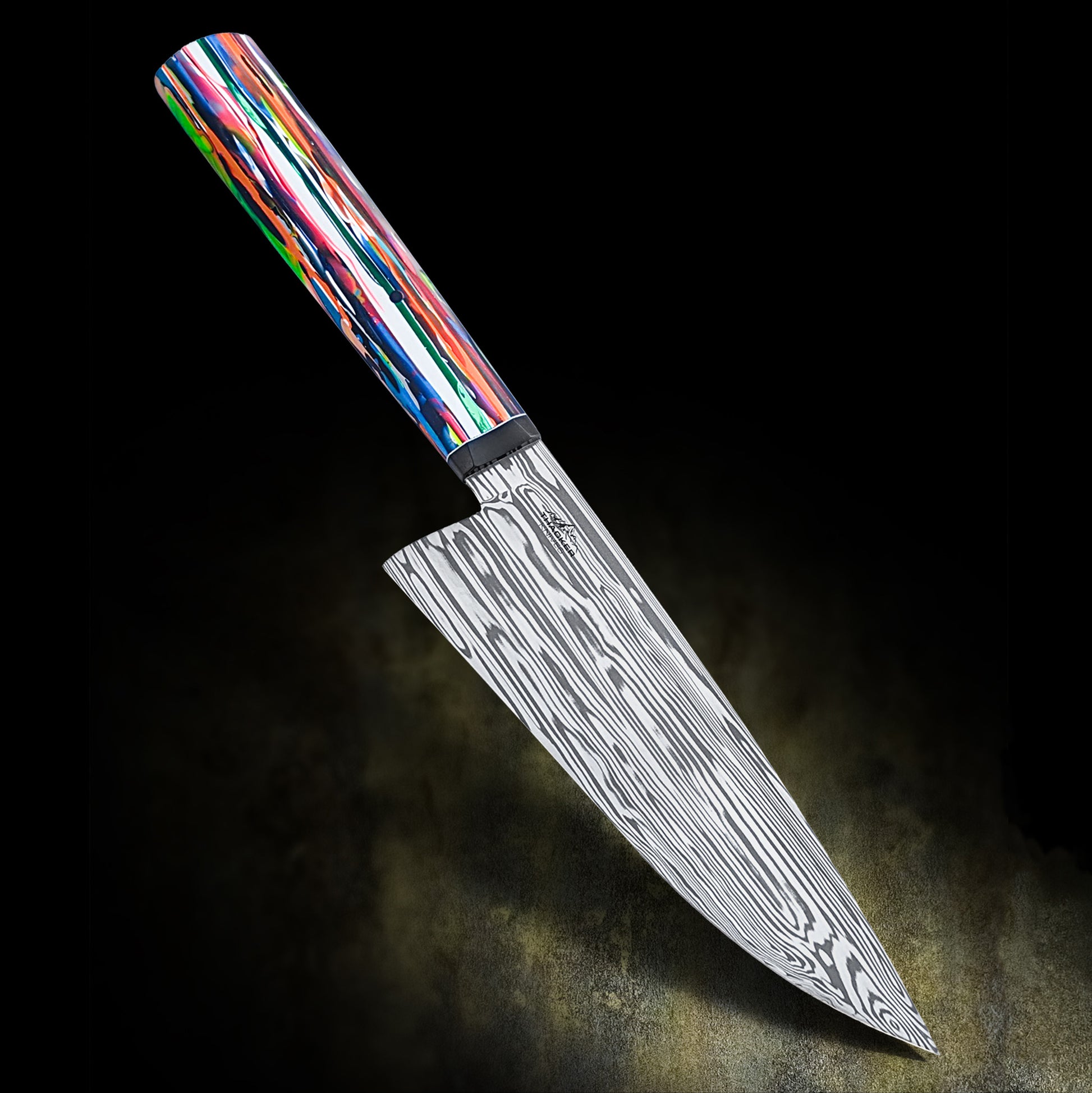 The stainless Damascus pattern is subdued, but works beautifully with the Kaotic Artworks Resin handle and black paper micarta bolster secured with a black G10 pin. The handle tapers towards the blade with some thickness left in the rear and palm for a multitude of comfortable grips. There are grooves at the bolster area allowing for a more comfortable pinch grip if you prefer.