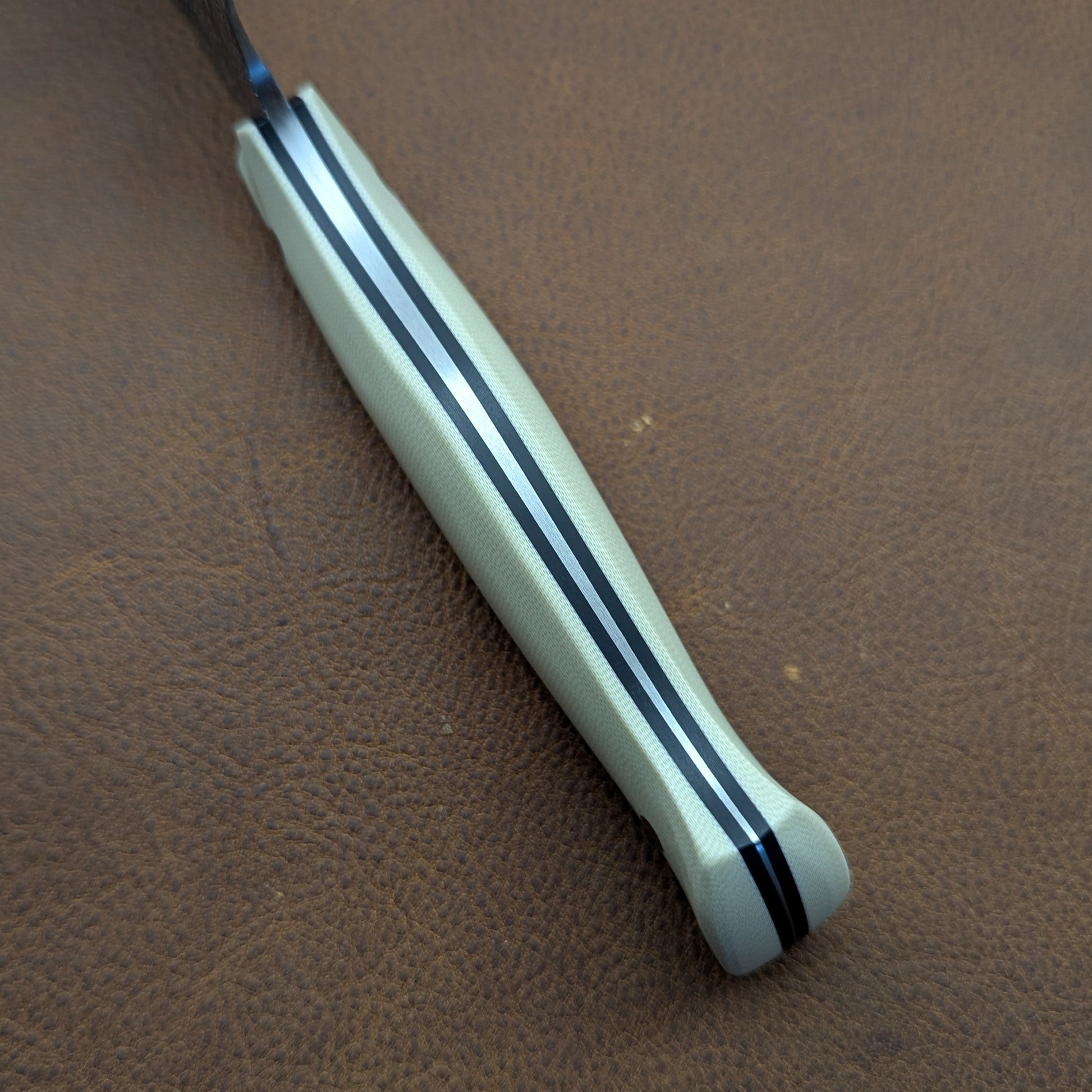 This stylish, functional 6" chef's knife will do the job beautifully. The blade is 50+ layers of handmade, random patterned Damascus steel with a tapered tang and an ivory G10 handle with black G10 liners. This unique piece is lightweight and extremely handy around the kitchen.