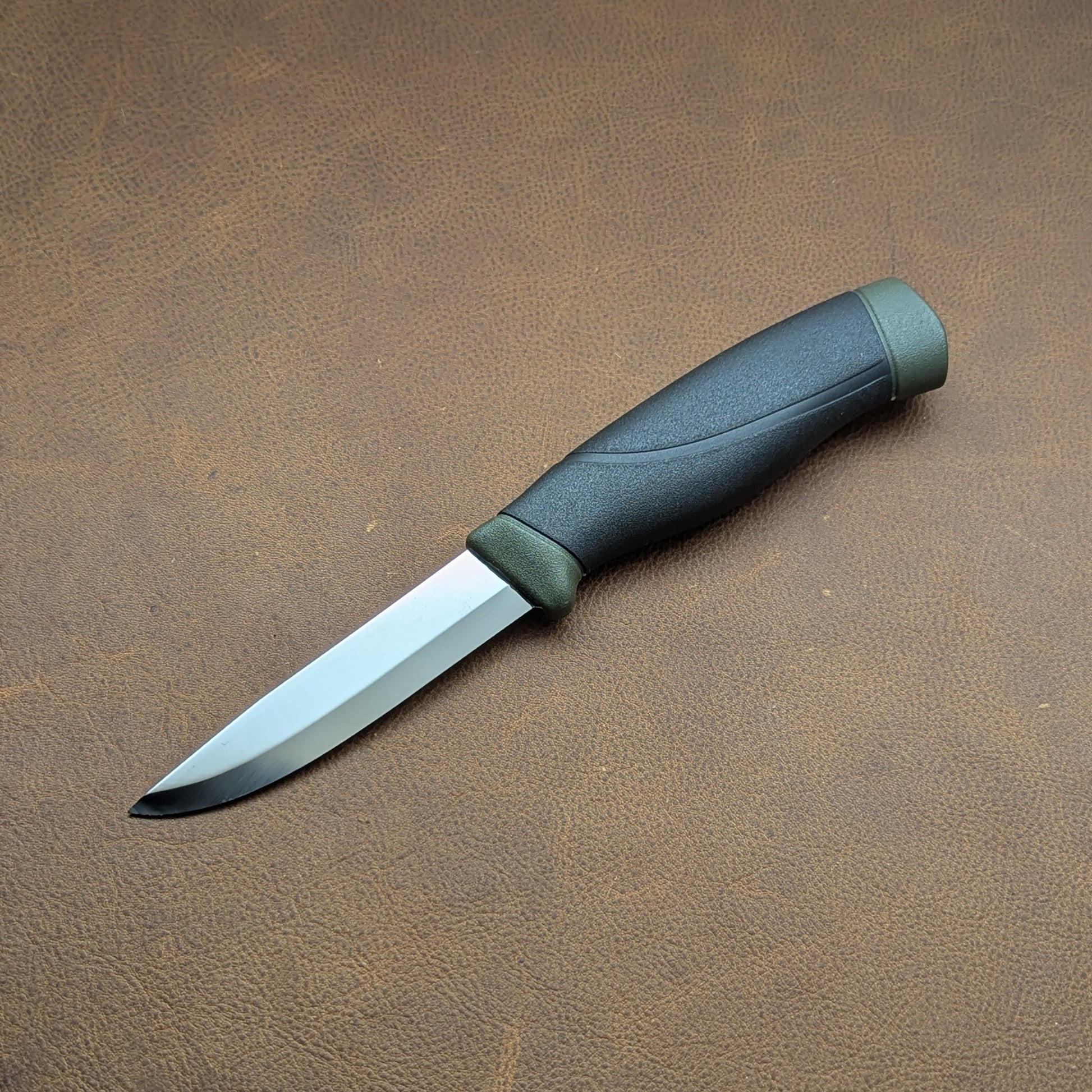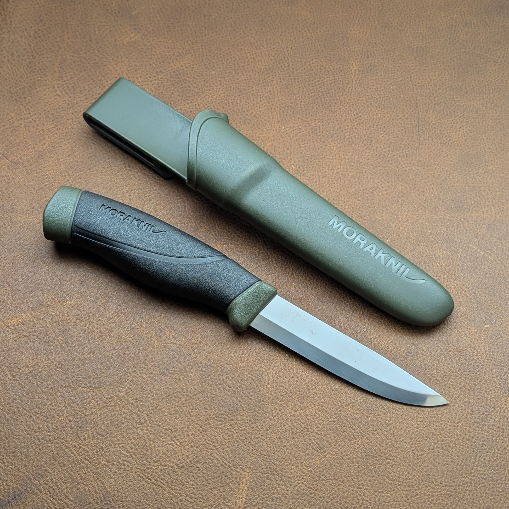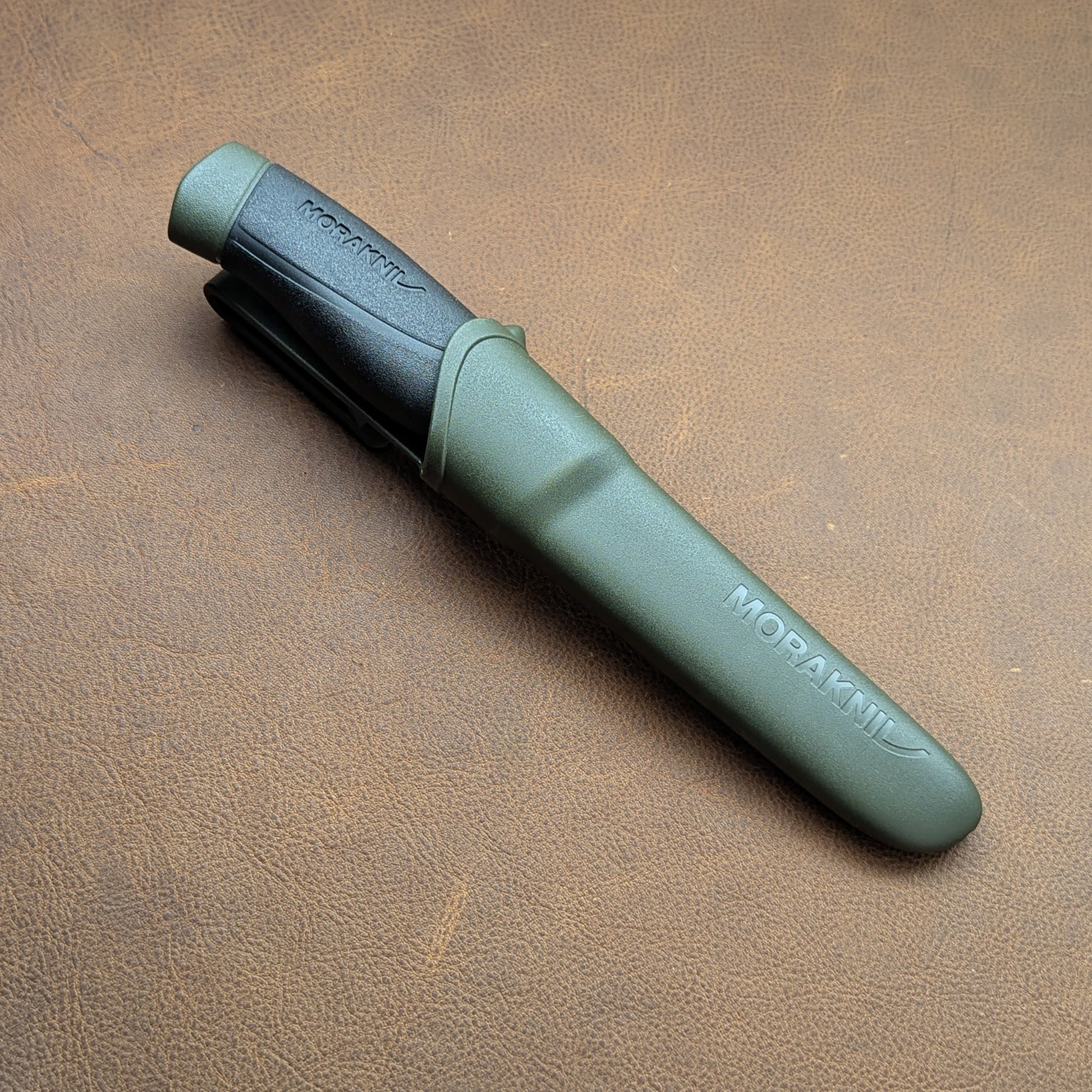 The Mora Companion HeavyDuty Military Green is designed for heavier utility or Bushcraft work. The sheath has a belt hook that can be snapped over the belt. It will securely fit belts up to 1 3/4" wide. It can also be fastened over wider belts, but doesn't lock as securely.