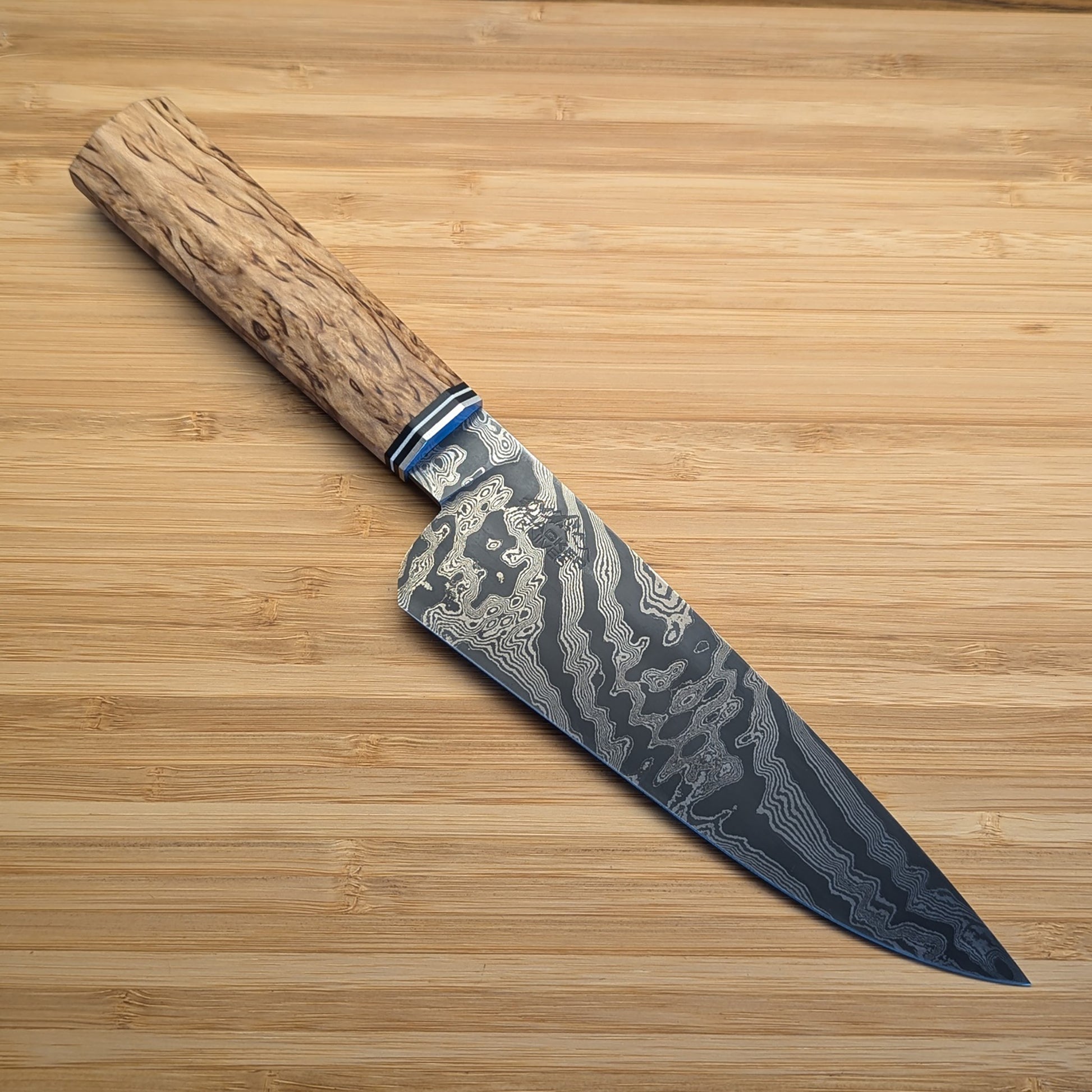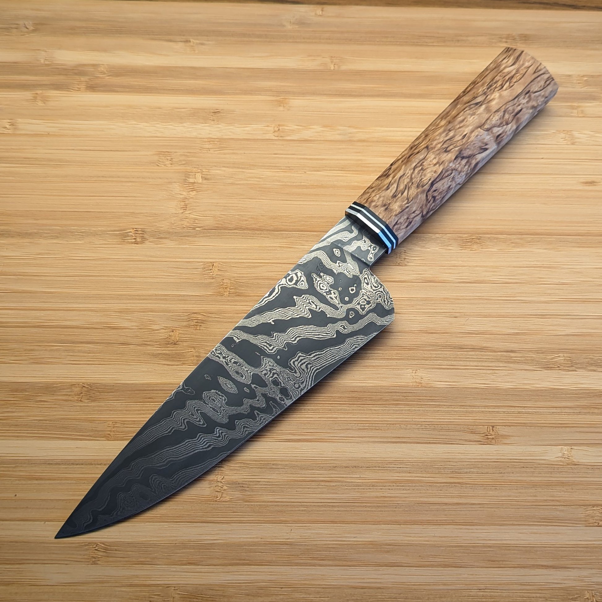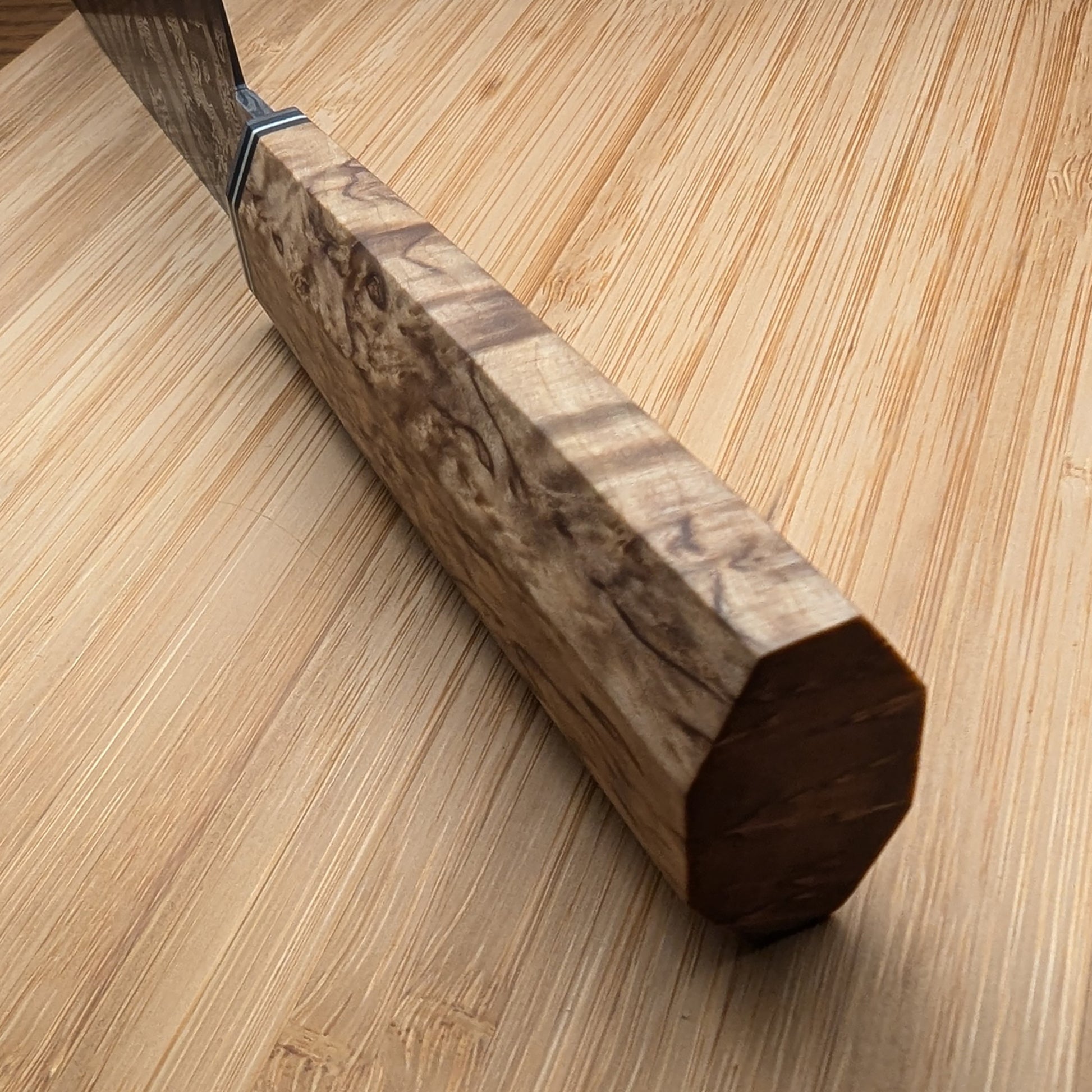 Here is a twist Damascus chef with a 6.25" blade and a comfortable, octagon shaped handle made with some stunning, stabilized curly birch. This is a unique piece with a bold, twist pattern and extremely light, just a touch over 5 oz.