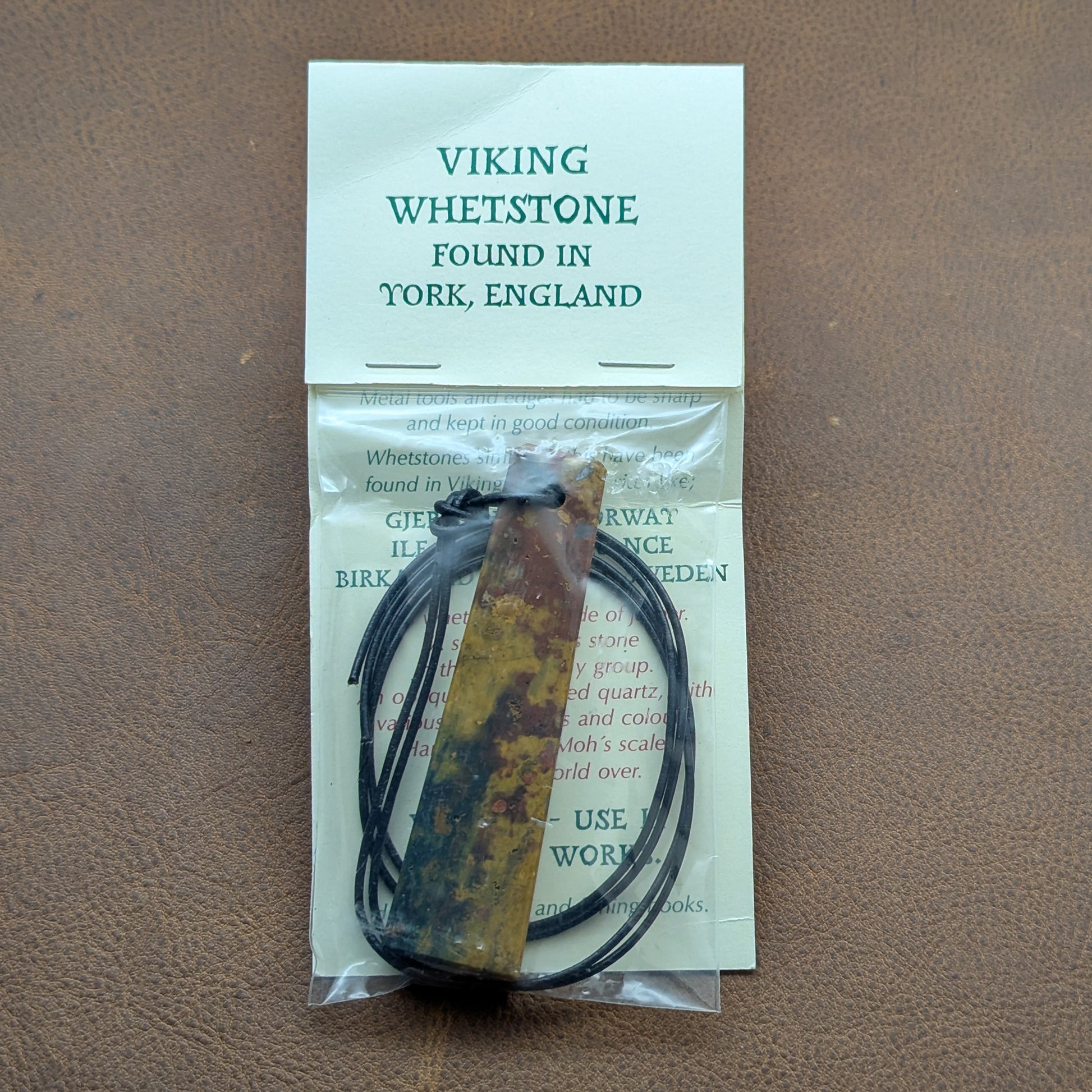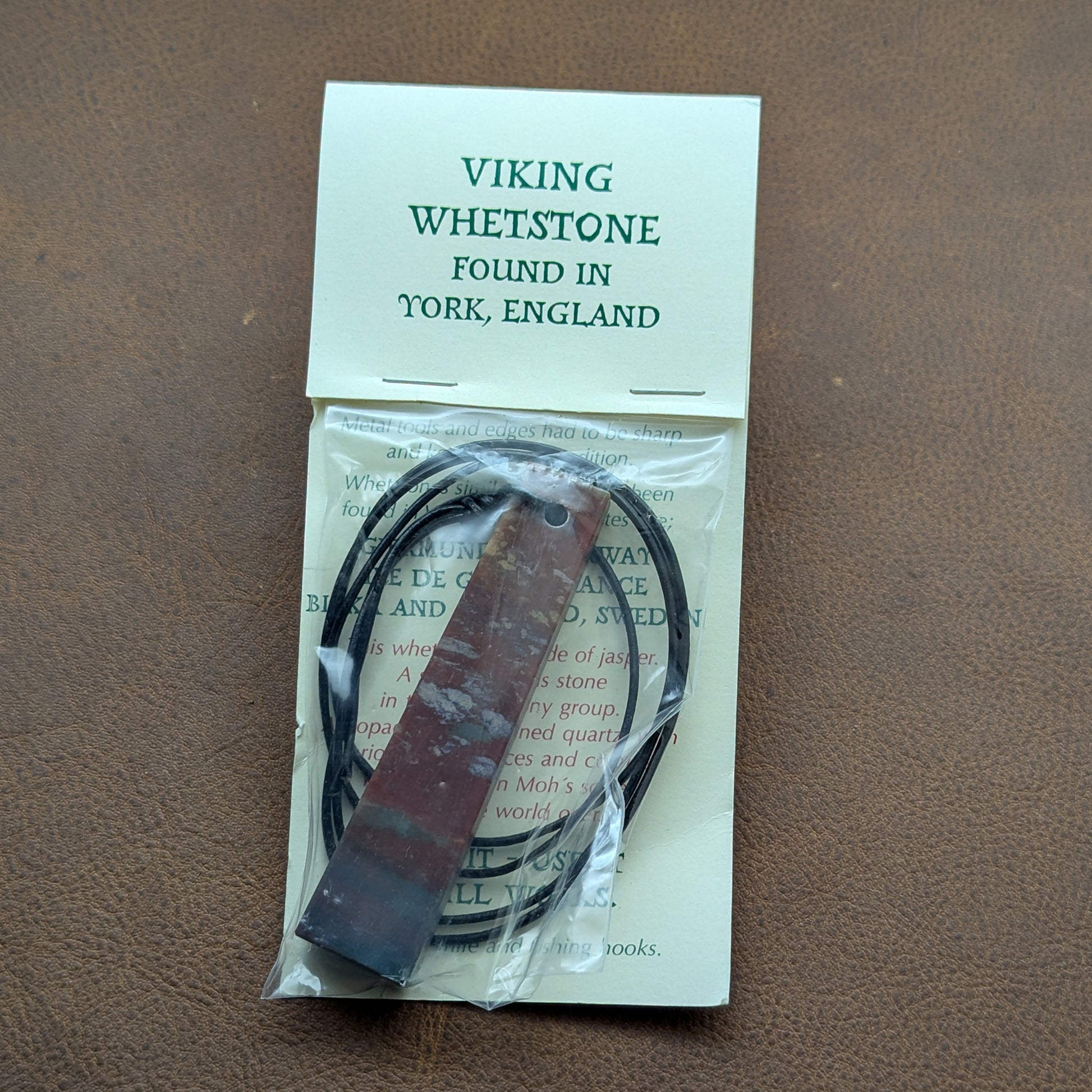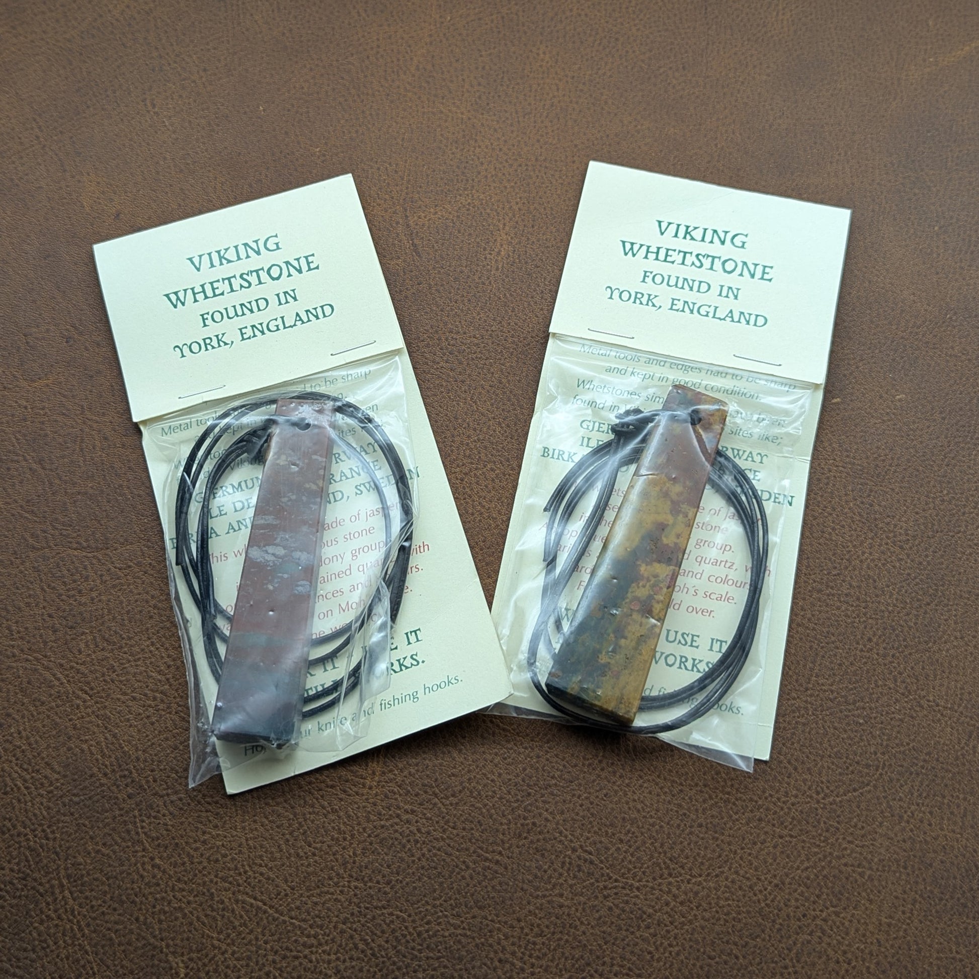 In Viking times small whetstones were often worn as pendants. These are reproductions of whetstone pendants found in Viking Age York. Similar pendants have been found in Kalåstad, Norway, Birka, and Gotland. They are cut from Jasper, and seem about midway between hard white and hard black Arkansas stones in action. That means they are very fine, and suitable for the honing a final edge rather than basic sharpening. They vary a little in size and shape, but most are about 3 1/4" long, just under an inch wide at the base, and 1/4" in thickness. Each comes with a string and descriptive packaging. I use them dry, and clean off the clogging residue as often as necessary with water.
